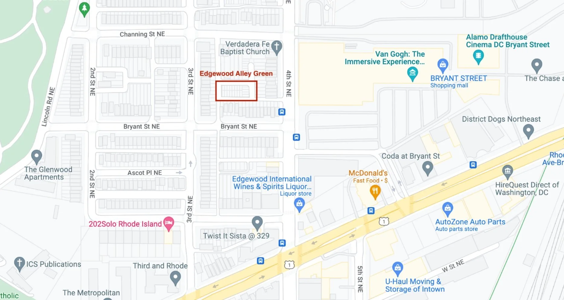 Located in the Edgewood neighborhood in Northeast Washington D.C, EAG centers on the alley bounded by Bryant Street NE to the south, Channing Street NE to the north, 3rd Street NE to the west, and 4th Street NE to the east.